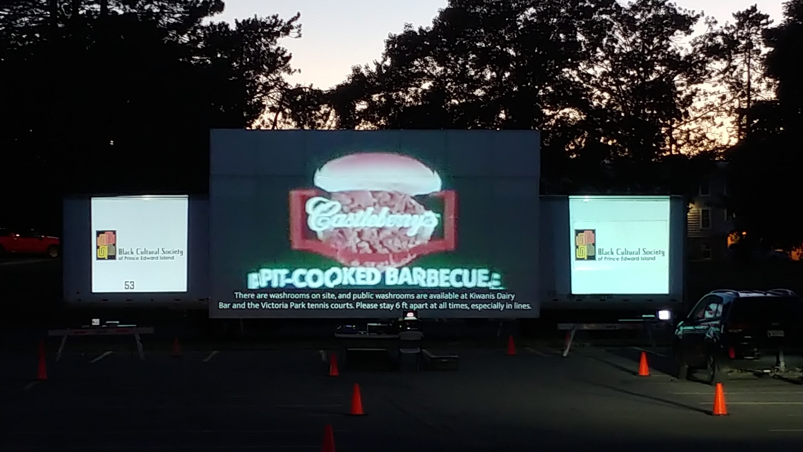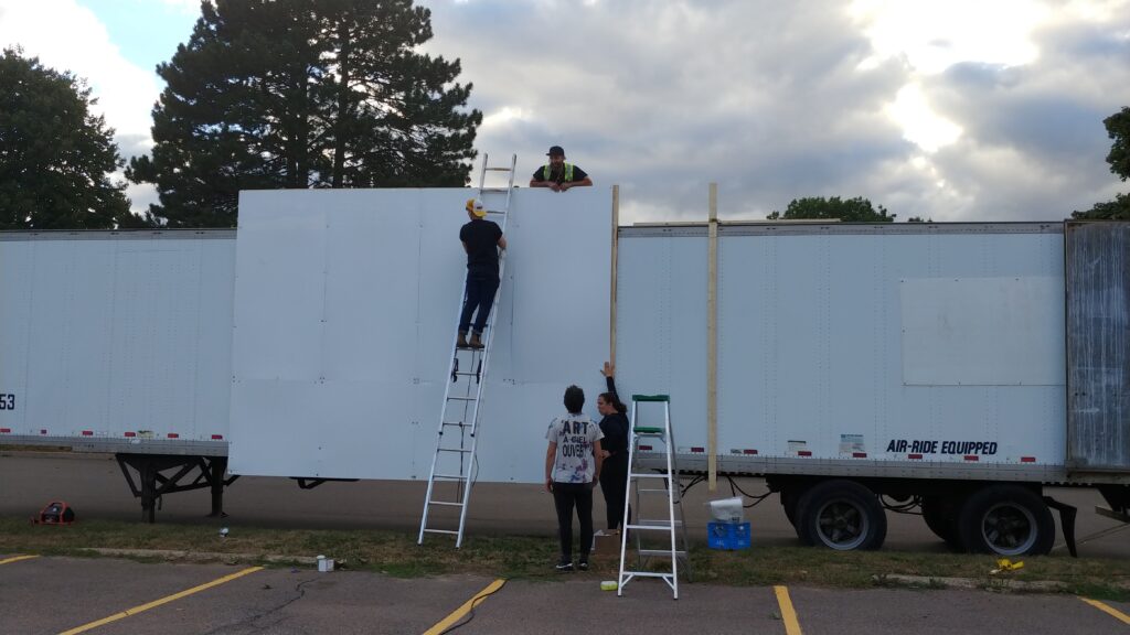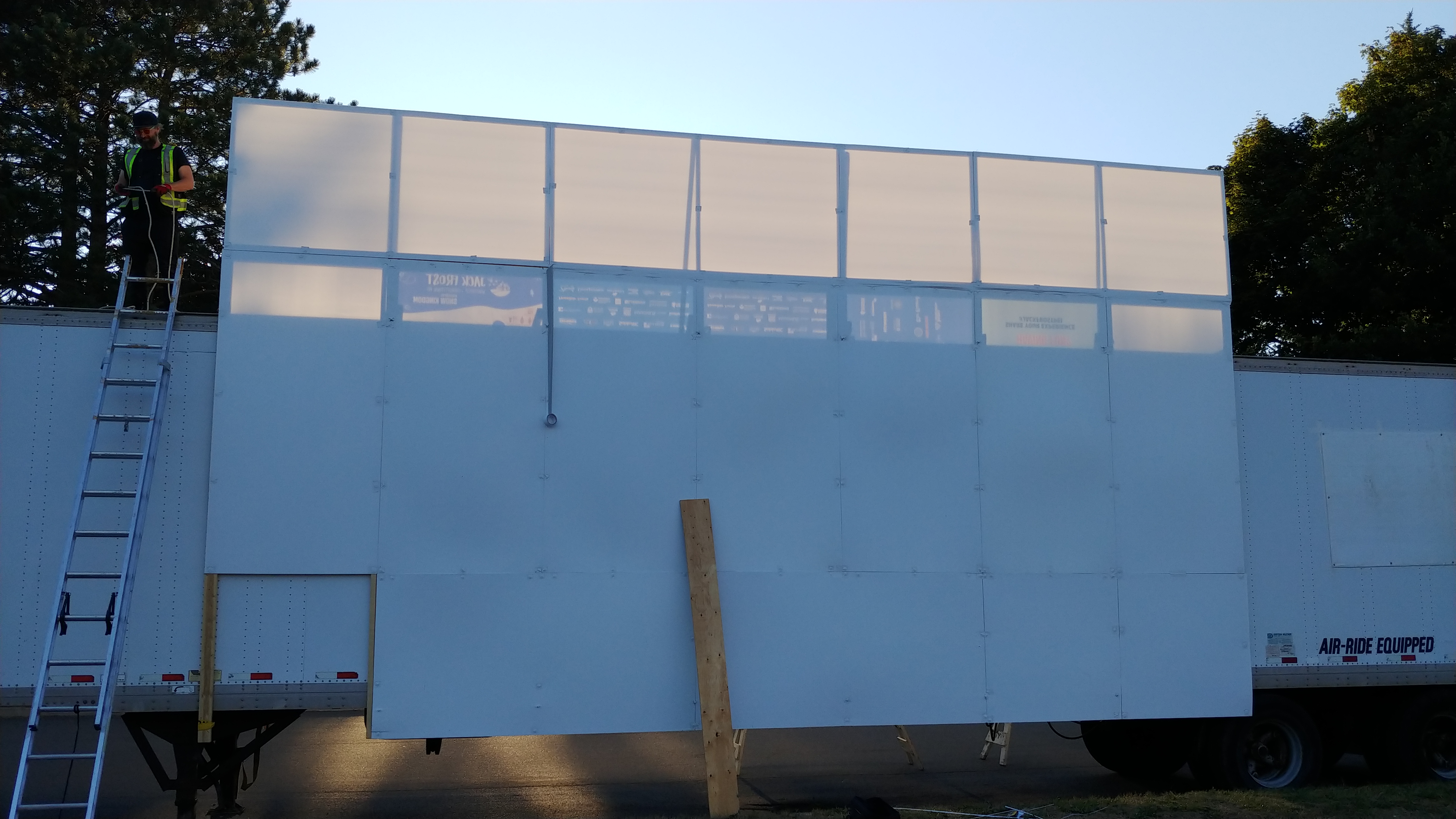 High winds prevented the deployment of an inflatable projector screen causing a risk of cancelling the event. Pat Caron & Pat Brunet came up with a solution to build a projector screen to the side of a transport truck allowing the show to go on.